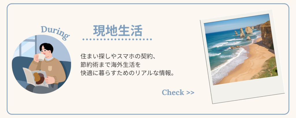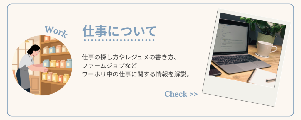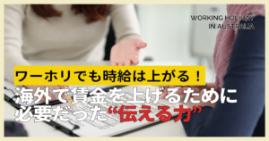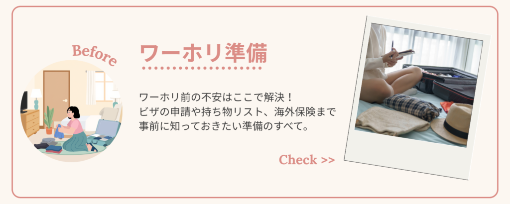 2026.04.25 ワーホリ準備 現地生活 仕事 人気記事 【2025年最新版】セカンドビザの申請方法【オーストラリア】 2024.09.022026.04.25 【2025年版】メディケア税免除証明のオンライン申請方法!【ワーホリ】 2024.07.092026.04.25 【最新版】自分でできる!Taxリターンの完全解説【オーストラリア】 2025.05.262026.04.25 これで安心!オーストラリアの風邪薬図鑑 2025.06.152026.04.25 【ファーム求人情報有】タスマニアで爆速セカンドビザ攻略!【オーストラリアWH】 2024.09.192026.04.25 私たちについて モニカ & ワタル 東京出身のカップル。ワーホリをきっかけに出会い、いまは世界を旅しながら暮らしています。「自由に生きる」をテーマに、経験や気づきをシェア中! 新着記事 3カ国ワーホリ経験者が語る!オーストラリアのファームジョブのリアル|時給・生活・セカンドビザ取得のコツ 無料で通訳が使える!?オーストラリアで病院に行った話【GP受診と費用を解説】 ワーホリでも時給は上がる!海外で賃金を上げてもらうために必要だった“伝える力” もう年齢ギリギリ。でもワーホリを諦めきれないあなたへ