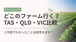 ファーム・仕事 「どのファームに行けばいい?」経験者が3拠点(TAS・QLD・VIC)を比べてわかったこと タスマニア(野菜)、ガットン・QLD(野菜)、ミルデューラ・VIC(ブドウ)の3拠点でファームを経験した筆者が、仕事のきつさ・生活環境・街の便利さを正直に比較します。どこに行くか迷っているワーホリ仲間の参考になれば嬉しいです。 2026.04.27 HOMEファーム・仕事